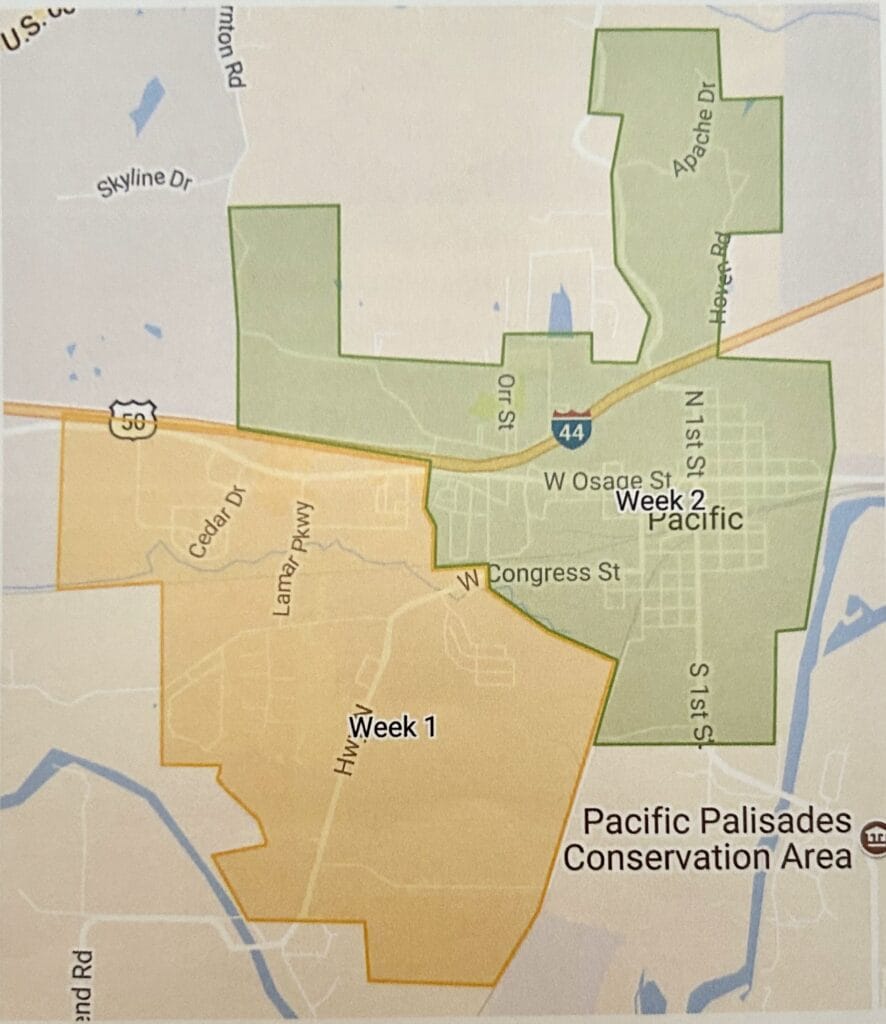 Downtown right by the depot, each railroad had large water tanks – one for eastward trains and one for westward trains. Those four water tanks provided the treated water necessary to fill the tenders of the steam locomotives before they tackled the grades both east and west. The water came out of the Meramec River near the sand and gravel works, and was piped alongside the right of way back into town to the water tanks by the station. A small pump house enclosed the water pump to provide the downtown tanks with an adequate supply. When a steam engine stopped for water, it was not uncommon to require a drink of 10,000 gallons at a time, before the train could leave to tackle the hills. Water along the tracks was available at nearly every station, but the Pacific location and supply were vital for train movements.